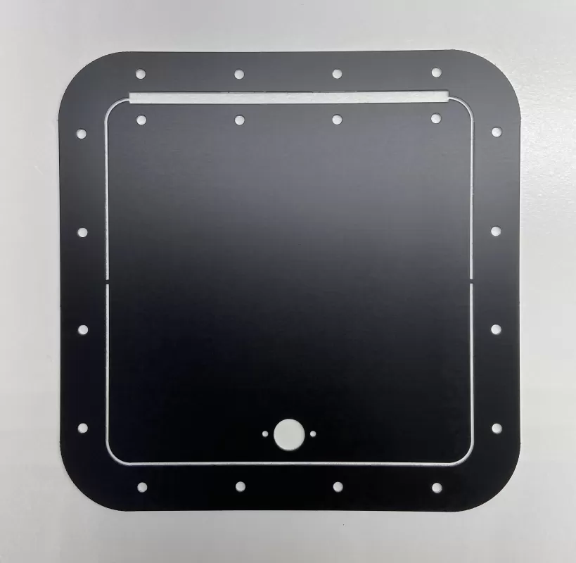 8" long by 8" wide flat black aluminum access door and frame. It comes with dzus springs and captivated dzus buttons as well as the hinge. This access door and frame come with a protective film for installation.