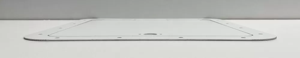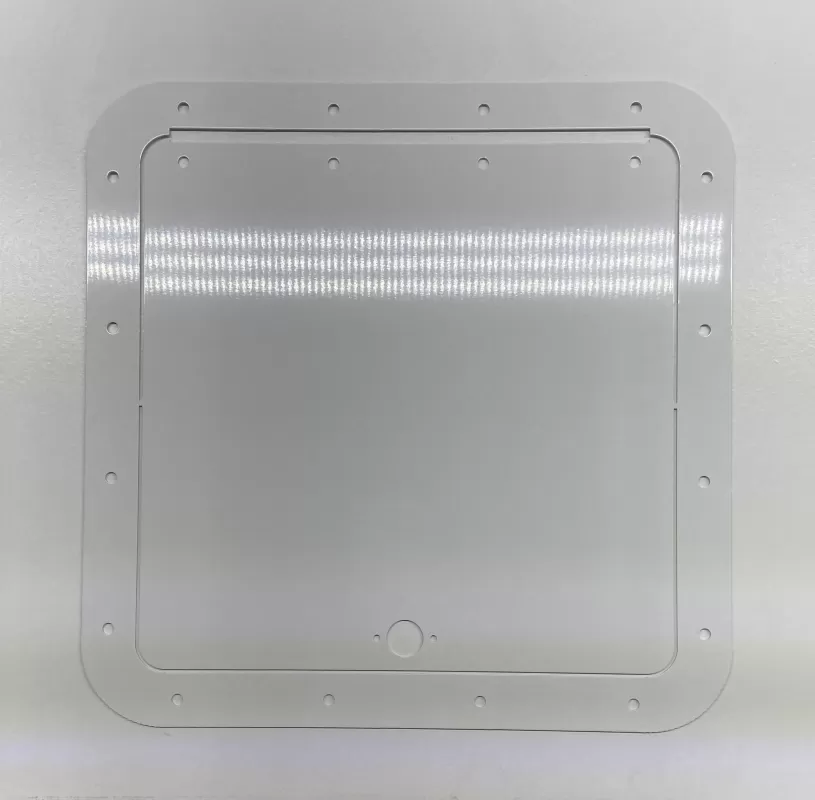 10" long by 10" wide white aluminum access door and frame. It comes with dzus springs and captivated dzus buttons as well as the hinge. This access door and frame come with a protective film for installation.