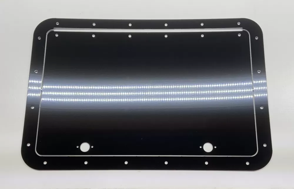 16" long by 10" wide gloss black aluminum access door and frame. It comes with dzus springs and captivated dzus buttons as well as the hinge. This access door and frame come with a protective film for installation.