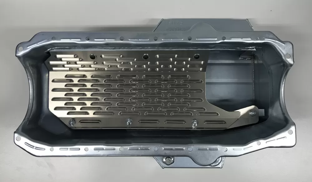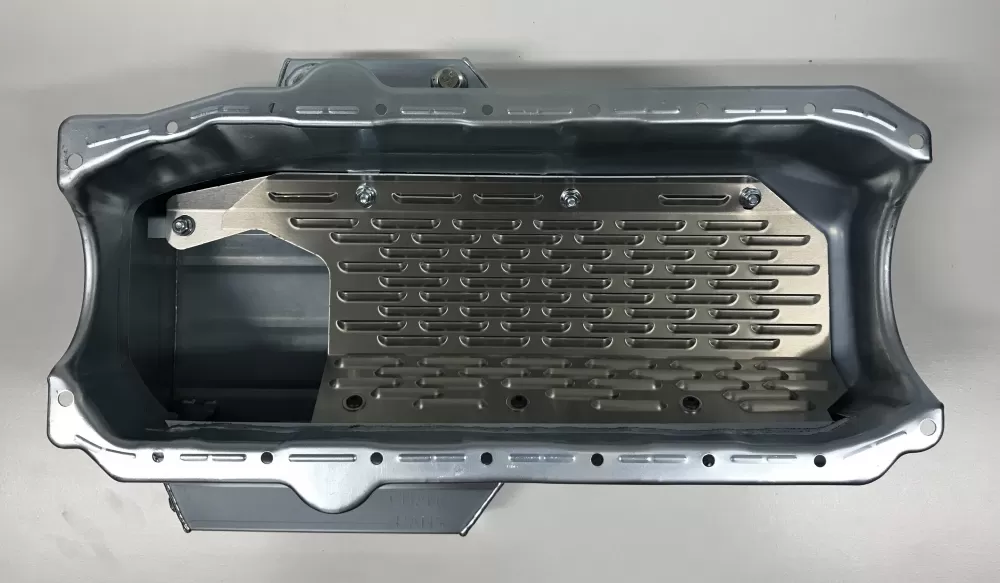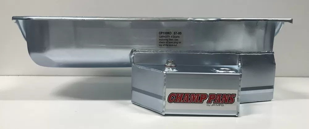 This steel wet sump oil pan is for the Small Block Chevrolet years 1957-1985 with the two piece rear main seal engines. This oil pan features: - a kick out that runs the length of the oil pan - a removable horsepower saving louvered windage tray - six trapdoors - three crank scrapers - two runners - an oil temp fitting - an oil check level plug - a clear zinc finish This oil pan is designed around the Chevrolet Camaro front stub with the engine set back. Oil capacity: 8 quarts with filter Use: Dirt circle track (super stock or midwest modified) Series: Competition Dipstick: Use JR131 Starter: Mini-starter Gasket: Thick front seal Dimensions: 12” L x 14" W x 7" H