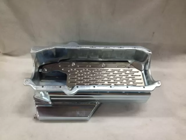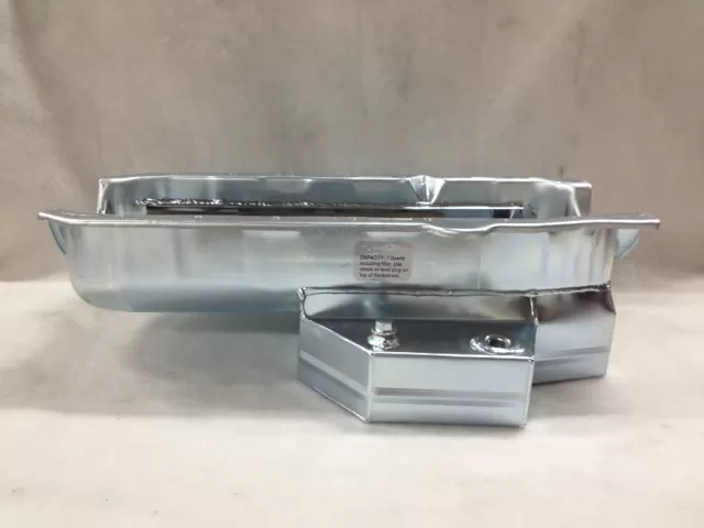 This steel wet sump oil pan is for the Small Block Chevrolet years 1957-1985 with the two piece rear main seal engines. This oil pan features: - a kick out that runs the length of the pan - the sump at 6 1/2” deep which allows for better ground clearance for asphalt race cars - six trapdoors - an oil temp fitting - an oil check level plug - a removable horsepower saving louvered windage tray - a clear zinc finish This oil pan is designed around the Chevrolet Camaro front stub with the engine set back. We recommend using an accusump because of the lower oil capacity, unless you are using a remote cooler and oil filter adapter. Oil capacity: 7 quarts with filter Use: Asphalt circle track (late model) Dipstick: Use JR131 Starter: Mini-starter Gasket: Thick front seal Dimensions: 12” L x 14" W x 6 1/2" H