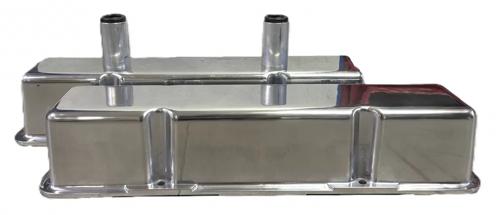 Polished aluminum valve cover set for the Small Block Chevrolet. This valve cover set features: