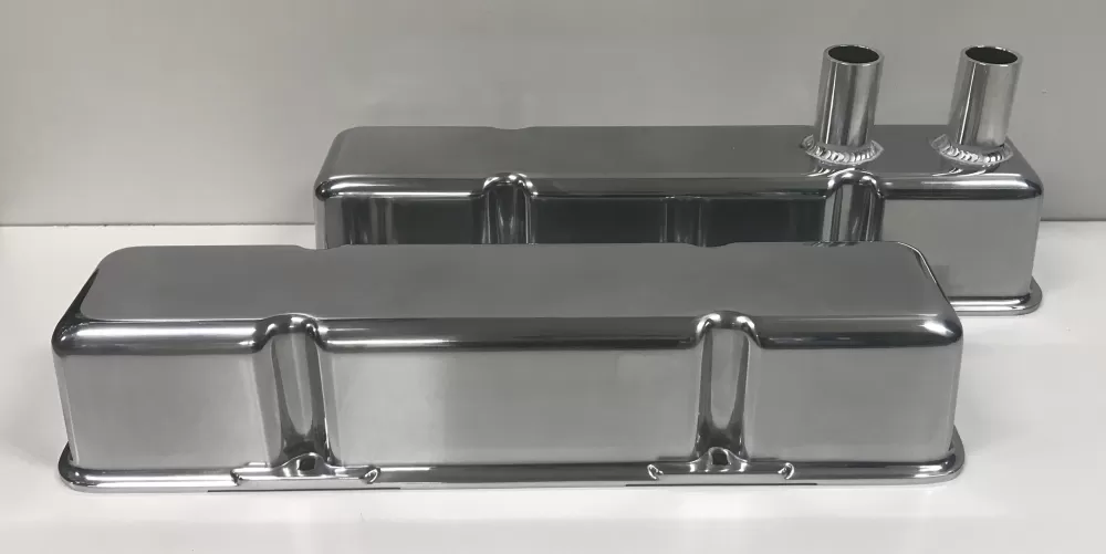 Polished aluminum valve cover set for the Small Block Chevrolet. This valve cover set features: