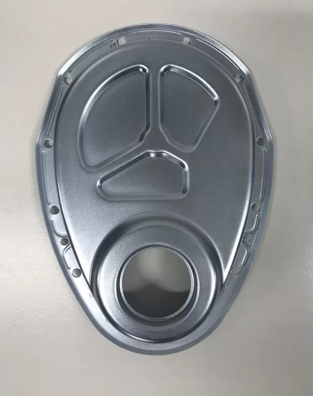 GM-style timing cover in silver for the Small Block Chevrolet years 1957-1974. This timing cover features: