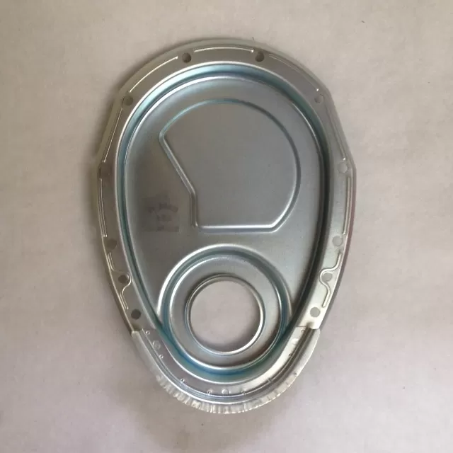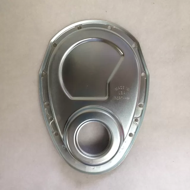 GM-style timing cover in silver for the Small Block Chevrolet years 1975 and newer. This timing cover features: