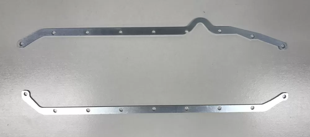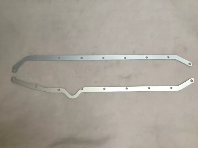 Pan rail girdle set for the Small Block Chevrolet years 1957-1979 with left side dipstick engines. This pan rail girdle set is designed to spread the torque force over a larger area to help seal the oil pan to the block, regardless of the gasket you use. It is .125" thick and conforms to our racing core oil pans; however, it will also fit stock-appearing core oil pans.