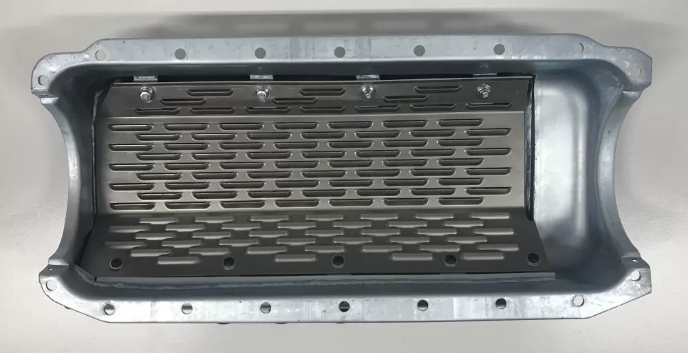- a kick out that is 1 1/4” below the pan rail and runs the length of the pan for increased oil control and torque