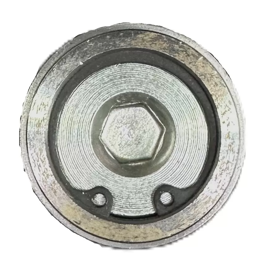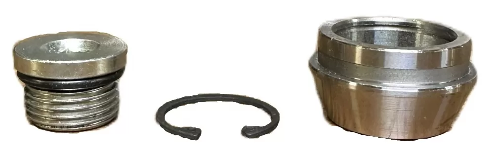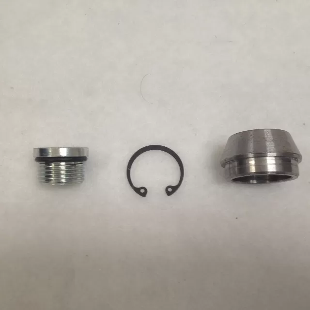 Replacement 3/4"-16 flat bottom zinc plug with a 7/8" bore diameter black-phosphate steel internal retaining ring clip and a steel #8 o-ring port with snap ring groove bung.