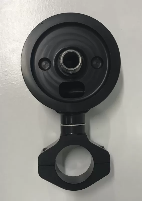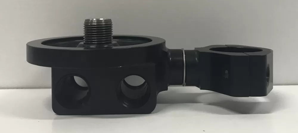 Remote oil filter mount that is anodized black. Thread is 13/16"-16 threads per inch with 1/2" NPT in/out ports.