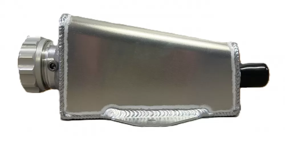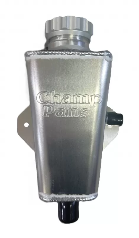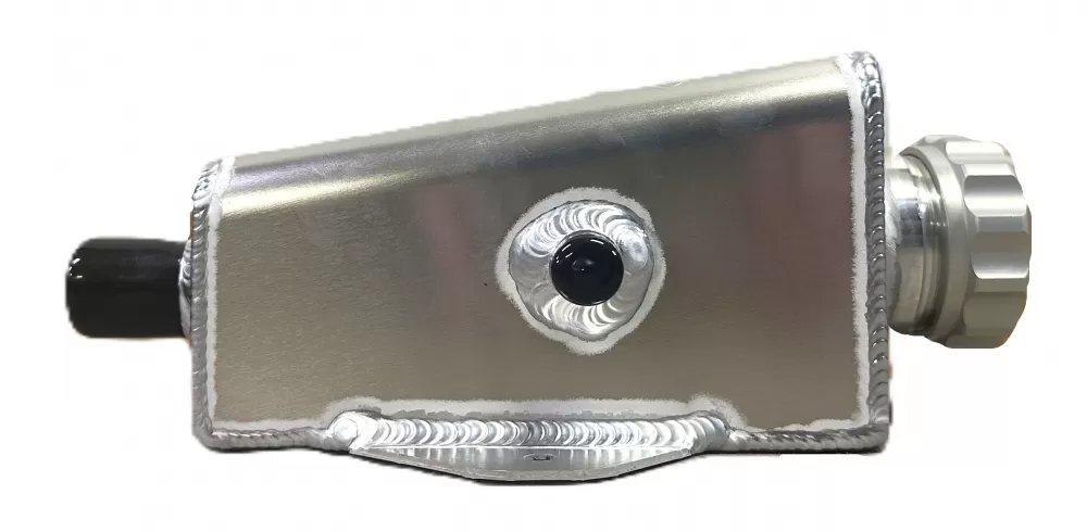 Aluminum power steering tank with right side fitting. It has an 1/8" pipe plug to give you the option to vent.