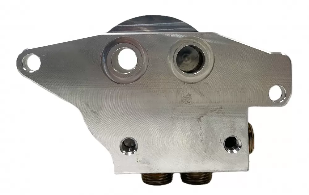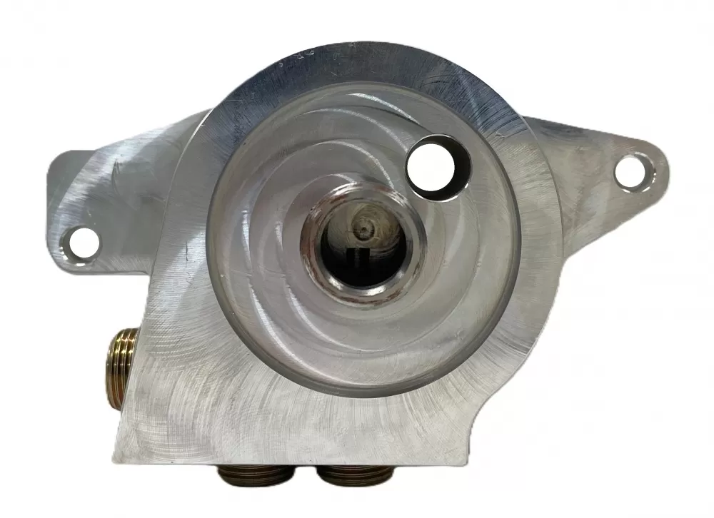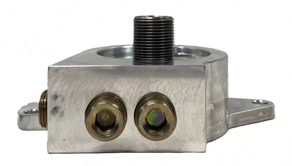 Billet aluminum oil filter adapter that is cross drilled and tapped for LS1 oil pans. Using this adapters eliminates the 7/8" cross over plate (LS1001-2) which allows for more clearance between exhaust headers and adapter.