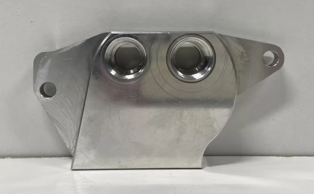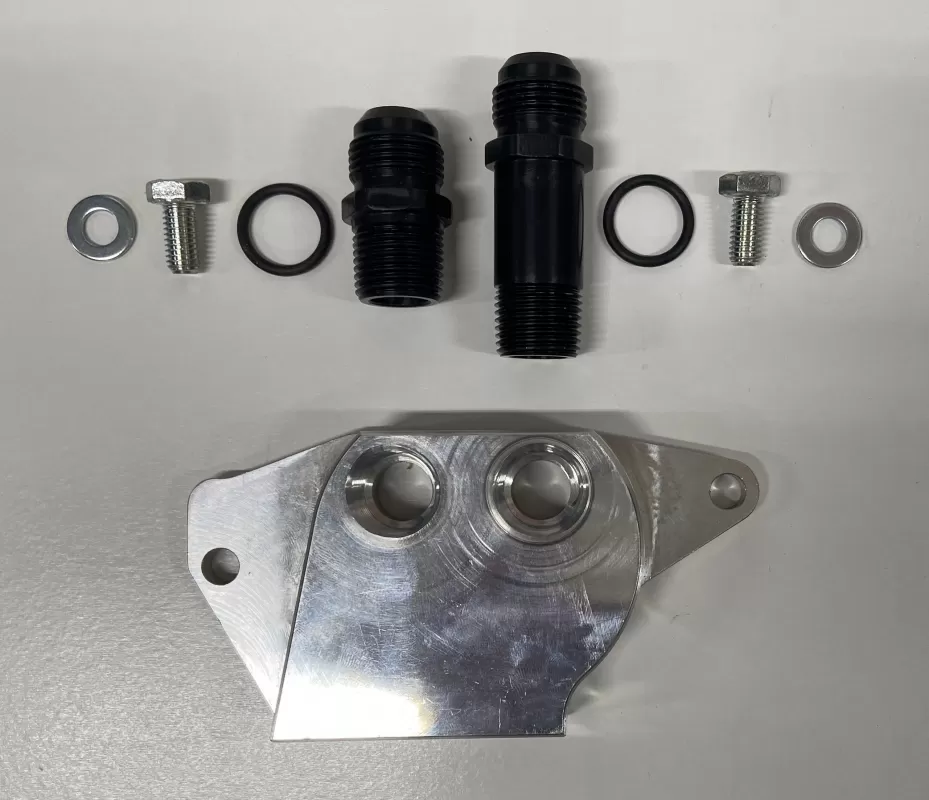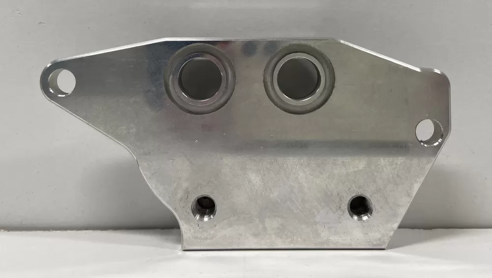 Billet aluminum remote filter block with -10 an fittings for LS1 oil pans.