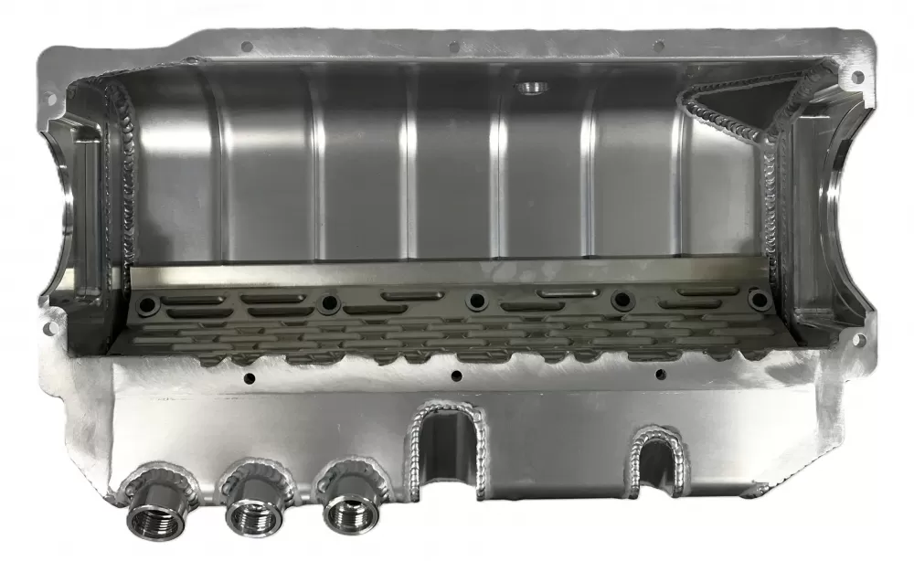 This aluminum dry sump oil pan is for the Small Block Chevrolet years 1986-2003 with a one piece rear main seal engines. This oil pan features: