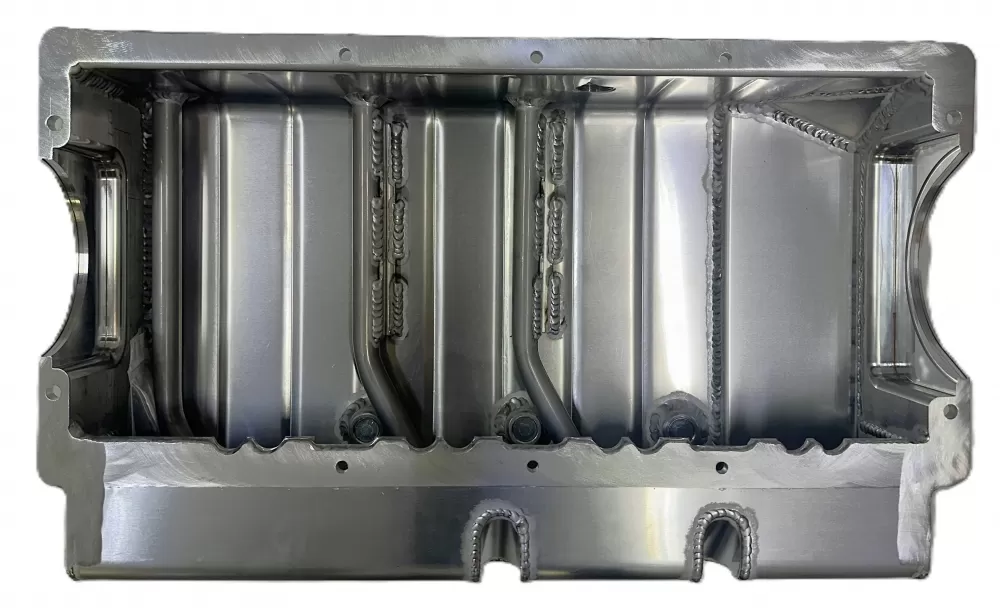 This aluminum dry sump oil pan is for the Dart Small Block Chevrolet engines with the spread rails. This oil pan features: