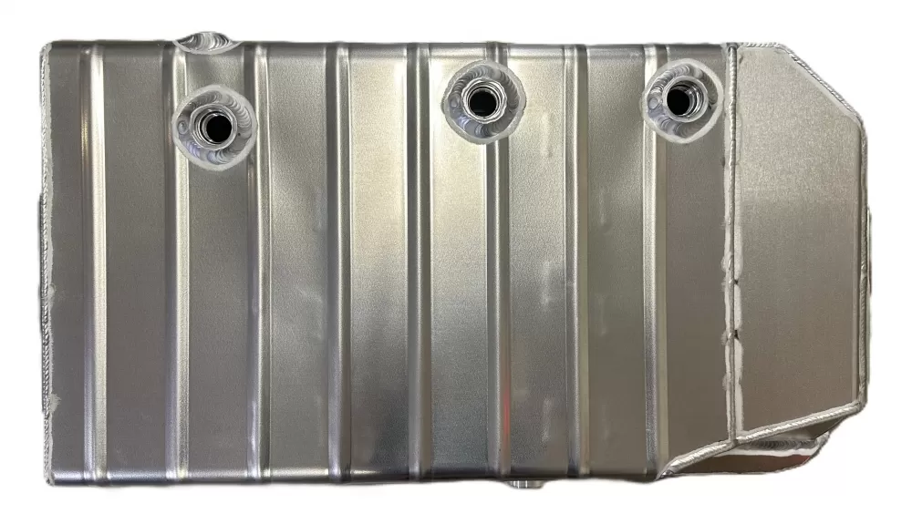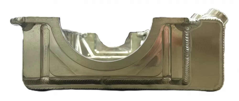 This aluminum dry sump oil pan is for the aluminum and cast iron Small Block Ford 351 Windsor engines. This oil pan features: - three -12 o-ring ports that exit the upper right rear of the pan - an inspection hole - a drain plug - more ground clearance Use: Asphalt circle track Dimensions: 4" deep; front is 3 7/8" deep