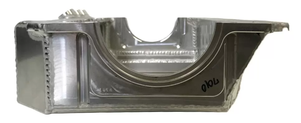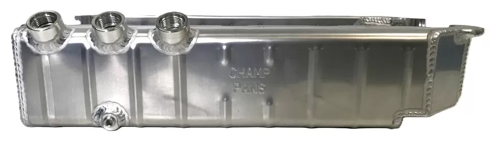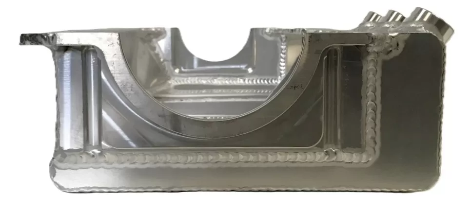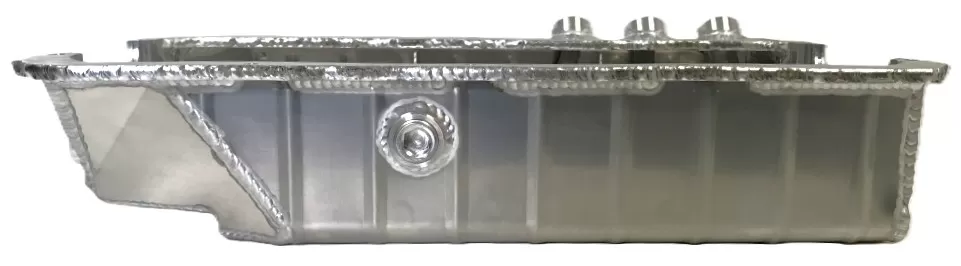 This aluminum dry sump oil pan is for the aluminum and cast iron Small Block Ford 351 Windsor and SVO engines. This oil pan features: - three -12 o-ring ports that exit the upper right rear of the pan - the front notched to clear the front cross member - more ground clearance Use: Asphalt circle track Dimensions: 4 1/2" deep; front is 3 3/4" deep